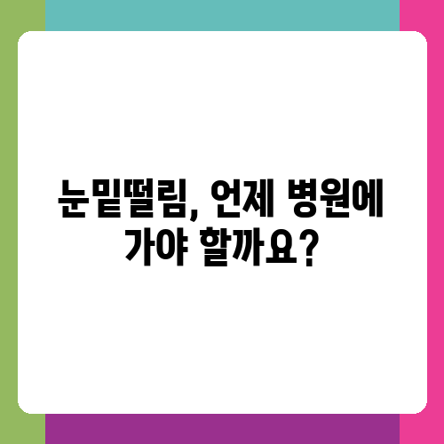 눈밑떨림이 며칠 이내에 자연스럽게 사라진다면 크게 걱정하지 않아도 됩니다. 하지만 몇 주 이상 지속되거나, 눈밑떨림과 함께 다른 증상들이 동반된다면 병원에 가서 진료를 받는 것이 좋습니다. 특히, 눈밑떨림과 함께 시력 저하, 두통, 어지럼증, 발음이 어눌해지는 증상, 팔다리 저림 등의 신경학적 증상이 나타난다면 즉시 병원을 방문하는 것이 중요합니다. 이러한 증상들은 심각한 질병의 전조 증상일 수 있기 때문입니다. 저는 개인적으로 눈밑 떨림과 함께 갑작스러운 두통이 발생했을 때 병원에 갔던 경험이 있습니다. 다행히 큰 문제는 아니었지만, 만약을 위해 미리 확인하는 것이 좋다는 것을 깨달았습니다. 자신의 몸에 대한 관찰을 통해 조기에 질병을 발견하고 적절한 치료를 받는 것이 건강을 지키는 가장 좋은 방법입니다.