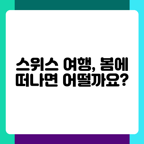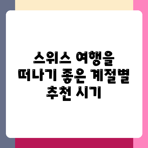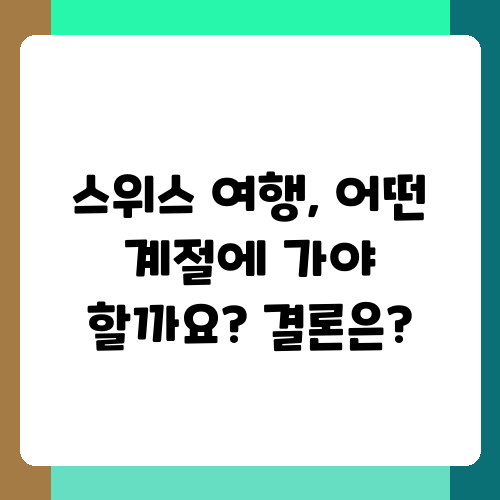봄부터 겨울까지, 계절별로 다채로운 매력을 뽐내는 스위스. 어떤 계절을 선택하느냐에 따라 여러분의 스위스 여행은 더욱 특별해질 수 있습니다. 본인의 여행 스타일과 취향에 맞춰 가장 좋은 계절을 선택하시고, 잊지 못할 추억을 만들어 보세요! 여러분의 스위스 여행이 행복으로 가득하길 바랍니다. 어떤 계절에 스위스를 방문하시든, 멋진 여행 되시길 바라요! 혹시 여행 계획이나 궁금한 점이 있으시면 언제든지 댓글 남겨주세요!