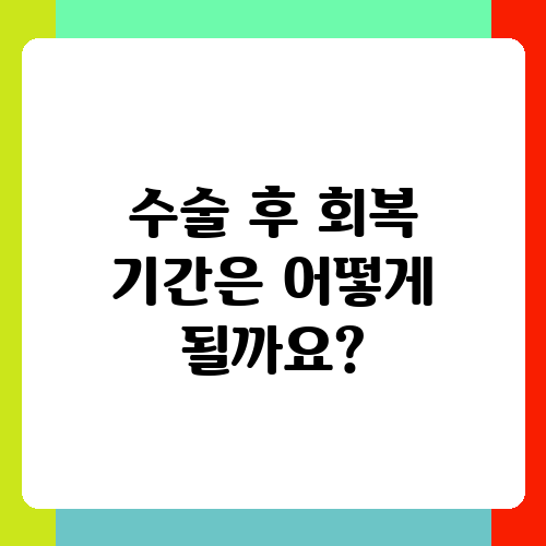 수술 후 회복 기간은 개인차가 있지만, 보통 1주일에서 2주일 정도 입원하여 치료를 받습니다. 퇴원 후에도 통원 치료를 받으면서 회복 과정을 점검해야 합니다. 수술 후 통증 관리가 중요하며, 의사의 지시에 따라 꾸준히 관리해야 합니다. 또한, 균형 잡힌 식단과 적절한 운동을 통해 회복을 촉진할 수 있습니다. 물론, 무리한 운동은 금물이고, 점진적으로 활동량을 늘리는 것이 중요합니다. 저는 수술 후 꾸준한 재활 운동을 통해 일상생활로 빠르게 복귀할 수 있었어요.