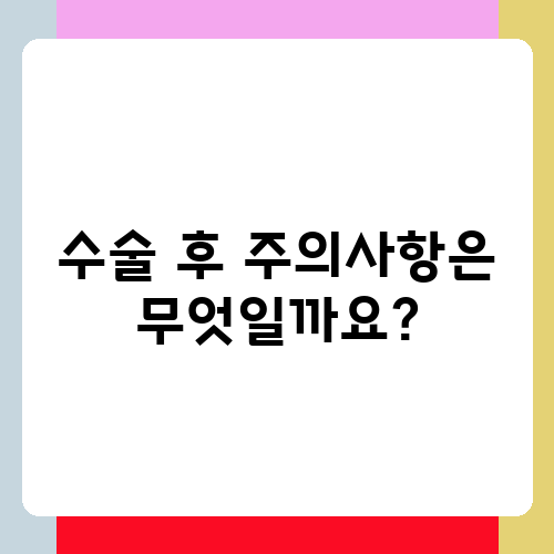 수술 후에는 감염 예방을 위해 깨끗한 환경을 유지하고, 정기적인 통원 치료를 받는 것이 중요합니다. 의사의 지시를 잘 따르고, 금주, 금연 등 생활 습관 개선에도 신경 쓰는 것이 도움이 됩니다. 수술 부위의 관리 또한 중요하고, 수술 부위에 이상이 있을 경우 바로 병원에 연락하는 것이 중요합니다. 무엇보다 스트레스 관리도 중요한 부분이에요. 편안한 마음으로 회복에 집중하는 것이 중요합니다.