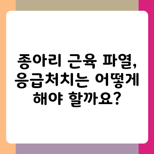 종아리 근육이 파열된 것 같다면, 우선 휴식이 가장 중요합니다. 파열된 부위에 무리한 힘을 가하지 않도록 주의해야 합니다. 얼음찜질을 통해 부기를 가라앉히고 통증을 완화할 수 있습니다. 20분 정도 얼음찜질을 하고, 20분 정도 휴식을 취하는 것을 반복하는 것이 좋습니다. 그리고 파열된 부위를 심장보다 높이 올려놓는 것도 도움이 될 수 있습니다. 압박붕대를 사용하여 부기를 줄이는 것도 효과적입니다. 하지만, 절대 스스로 진단하고 치료하려고 하지 마세요. 가능한 한 빨리 병원을 찾아 의사의 진찰을 받는 것이 가장 안전하고 효과적인 방법입니다. 자칫 잘못된 응급처치로 인해 증상이 더 악화될 수 있으니까요.