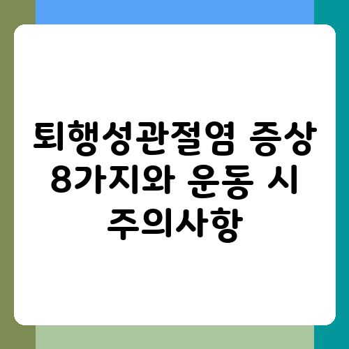 관절이 욱신거리고 뻣뻣해서 움직이기조차 힘들다면 퇴행성관절염을 의심해볼 수 있습니다. 나이가 들면서 자연스럽게 찾아오는 질환이라고 생각하지만, 조기에 증상을 알아차리고 관리하면 통증을 줄이고 관절 건강을 지킬 수 있어요. 오늘은 퇴행성관절염의 주요 증상 8가지와 운동 시 주의해야 할 점들을 자세하게 알려드리겠습니다. 퇴행성관절염은 무엇보다 예방과 관리가 중요하다는 사실, 잊지 마세요!