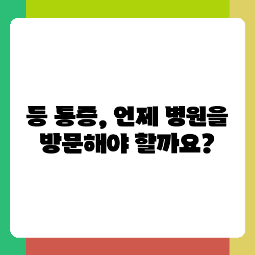 등 통증은 대부분 며칠 안에 저절로 좋아지지만, 다음과 같은 경우에는 병원을 방문하여 진찰을 받는 것이 좋습니다. 통증이 심하거나 며칠 이상 지속되는 경우, 밤에 통증이 심해 잠을 잘 수 없는 경우, 통증과 함께 발열이나 감염 증상이 나타나는 경우, 다리로 통증이 뻗치거나 마비 증상이 있는 경우, 배뇨 장애나 대변 장애가 있는 경우 등입니다. 이러한 증상은 심각한 질환의 징후일 수 있으므로, 빠른 진료가 중요합니다. 자신의 증상을 정확하게 파악하고, 꼭 필요한 경우 병원에 방문하여 전문적인 치료를 받는 것이 건강을 지키는 지름길입니다. 방치하면 더 큰 문제를 초래할 수 있으므로 주저하지 마세요.