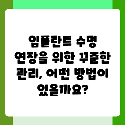 임플란트의 수명을 늘리기 위해서는 꾸준한 관리가 필수입니다. 앞에서 언급한 구강 청결 관리와 정기적인 치과 검진 외에도 건강한 생활 습관을 유지하는 것이 중요합니다. 금연은 필수이고요, 균형 잡힌 식단과 충분한 수면을 통해 면역력을 높이는 것이 중요합니다. 또한, 과도한 음주와 스트레스는 잇몸 건강에 악영향을 줄 수 있으니 주의해야 합니다. 정기적인 검진을 통해 임플란트 상태를 확인하고, 필요한 경우 추가적인 관리를 받는 것이 좋습니다. 예를 들어, 임플란트 주변에 치석이 쌓이면 염증이 발생할 수 있으므로, 스케일링을 통해 치석을 제거해야 합니다. 저는 임플란트 수술 후에도 건강한 식습관과 충분한 수면을 유지하려고 노력하고 있어요. 지금처럼 꾸준히 관리하면 오랫동안 건강한 임플란트를 유지할 수 있을 거라고 생각합니다.