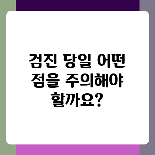 건강검진 당일에는 몇 가지 주의 사항을 꼭 지켜주세요. 첫째, 병원에 미리 도착하여 대기 시간을 줄이는 것이 좋아요. 검진 예약 시간보다 일찍 도착하면 여유롭게 검진을 받을 수 있답니다. 둘째, 검사 전 안내문을 꼼꼼히 확인하고 안내에 따라 검사를 진행해야 해요. 잘못된 방법으로 검사를 받으면 정확한 결과를 얻을 수 없을 수도 있으니 주의가 필요해요. 셋째, 검진 과정에서 궁금한 점이 있으면 담당 의료진에게 바로 질문하는 것이 좋아요. 주저하지 말고 궁금한 점을 질문하여 정확한 정보를 얻는 것이 건강 관리에 훨씬 더 도움이 된답니다. 넷째, 검진 후에는 충분한 휴식을 취하고 수분 섭취를 충분히 하는 것이 좋아요. 검진 과정에서 몸에 무리가 갈 수 있으므로, 충분한 휴식은 빠른 회복에 도움이 된답니다. 다섯째, 검진 결과는 일정 시간 후에 받아볼 수 있으니, 결과 통보 방법과 일정을 미리 확인하는 것이 좋답니다. 결과를 꼼꼼히 확인하고, 필요한 경우 의료진과 상담을 통해 추가적인 검사나 치료를 받도록 하는 것이 건강 관리의 핵심입니다.