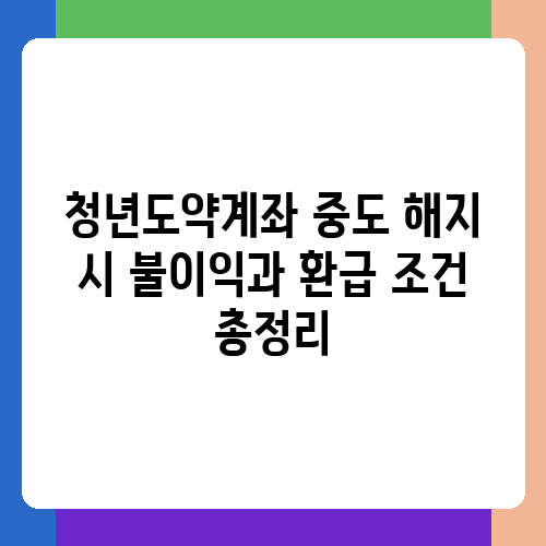 젊은 시절, 미래를 위한 저축은 정말 중요하죠. 그래서 많은 청년들이 정부 지원을 받을 수 있는 청년도약계좌에 가입하는데요. 하지만 예상치 못한 상황으로 중도 해지를 고려해야 할 때도 있습니다. 이럴 때 가장 궁금한 것은 바로 불이익과 환급 조건이겠죠. 이 글에서는 청년도약계좌 중도 해지 시 발생하는 불이익과 환급받는 방법에 대해 자세히 알아보고, 혹시라도 중도 해지를 고민하고 있다면 어떤 점을 고려해야 하는지 함께 살펴보겠습니다.
